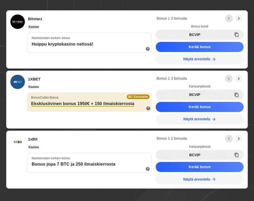 Kun tehdään talletusta Briten kautta voi myös napata tervetuliaisbonuksen, jonka saa promokoodin avulla. Sen on usein kirjoitettava kun rekisteröidy. Suomen parhaita bonuskoodeja löytyy meidän etusivultamme!
